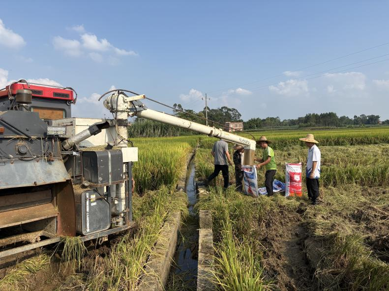 专家服务指导组在武鸣区陆斡镇水稻基地指导群众抢收成熟稻谷。