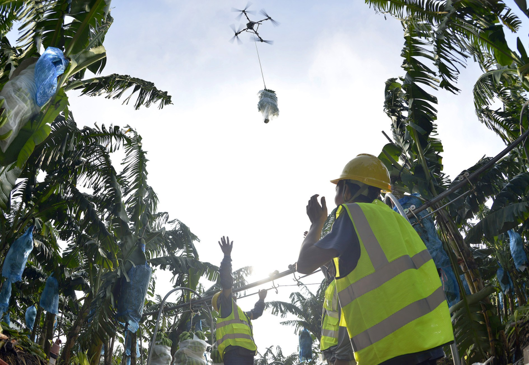 坛里香蕉园使用无人机运送香蕉。 (滕忠 摄)