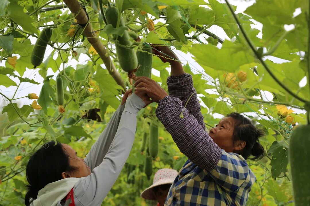 “以前总愁没活干,现在在基地摘瓜,既能照顾家里老人孩子,每月还能挣几千块,日子越过越有盼头!”正在田间忙碌的赖凤莲和玉秋香,一边麻利地将毛节瓜放进篮子,一边笑着道出心声。