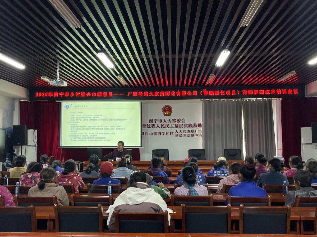 近日,由马山县妇女联合会牵头组织的乡村振兴巾帼项目种鹅养殖技术培训班在广西马鸿久家禽孵化有限公司培训基地举行。作为落实南宁市乡村振兴巾帼行动的关键举措,此次培训精准对接农村妇女发展需求,以技能赋能激活乡村产业活力,为马山县妇女投身乡村振兴搭建了实用平台。