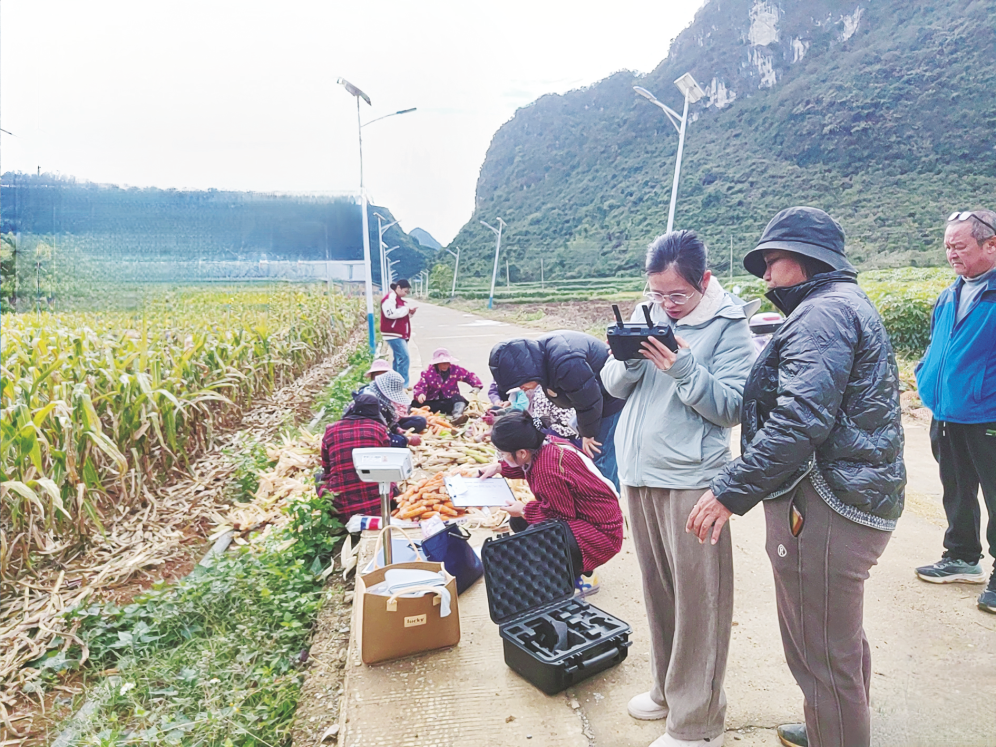 初冬的马山,天高云淡,丘陵之间铺展开一片片玉米的“青纱帐”。沉甸甸的果穗在阳光下泛着金黄色的光泽,空气中弥漫着谷物将熟的清香。连日来,一支由马山县农业农村局技术员组成的农技测产小队,穿梭于田间垄上,丈量、计数、称重、记录……他们用手中的测绳与仪器,为今年的收成进行最严谨的统计。