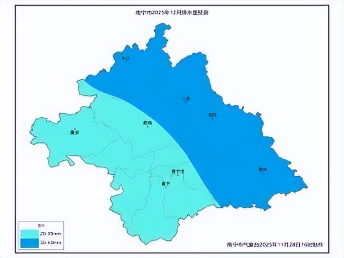 预计2025年12月南宁市各县(市、区)降雨量20~40毫米(图2),上林县偏少20%~30%,其余县(市、区)偏少10%~20%。
