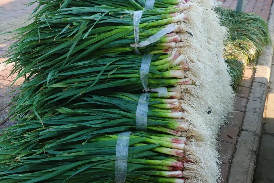 刚采收的新鲜香蒜整齐码放等待装运。