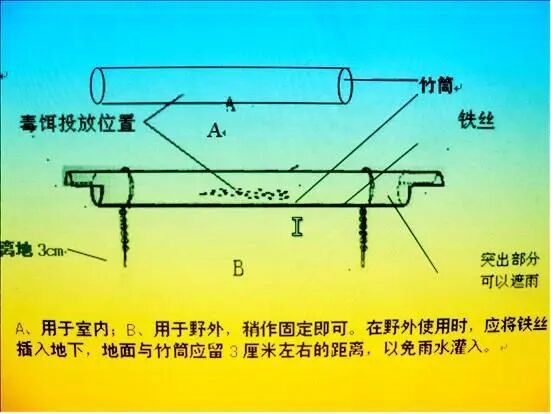 制作:取内径大于6厘米的竹子、PVC塑料管或硬质塑料瓶,锯成长60厘米的筒状,将内部打通,两端各保留5厘米的“耳朵”作为防雨檐,用铁丝绑住两头并将铁丝脚插入泥土中固定,毒饵站离地面约3厘米,防止雨水流入。