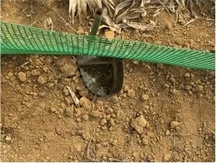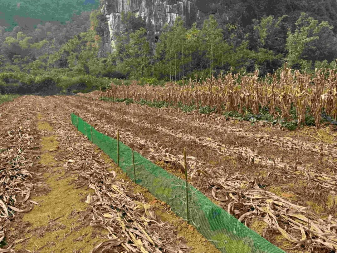 在田边设置高约50厘米(地下深埋15-20厘米)的封闭式金属或塑料网围栏,形成阻隔带。沿围栏每间隔5-8米设置漏斗形单向入口,入口连接内部捕鼠桶或捕鼠笼。一般200亩左右田块设置1个60米TBS围栏即可有效防控害鼠,建议春播前安装,定期检查并清理捕获鼠体,直至作物生长期结束。