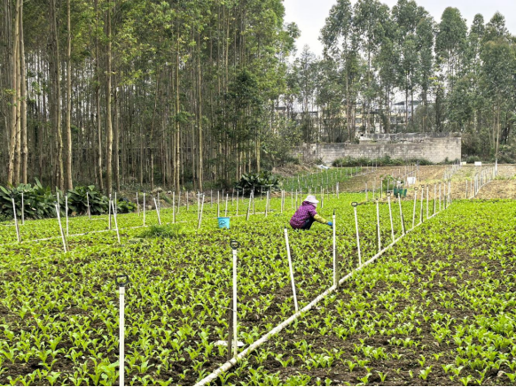 早在立春前,吴圩镇春耕备耕已有序开展。农户依托地势发展露地速生蔬菜与简易大棚种植。镇农业服务中心农技人员深入村坡,结合气候和地块实际开展“一对一”技术指导,讲解早春蔬菜选种、整地、播种及水肥管理要点,推广绿色种植技术,引导科学防控病虫害、减少农药使用。同时推广节水高效、操作简便的喷灌技术,实现精准水肥一体化供给,既优化当前蔬菜管护模式,也为后续设施大棚标准化种植筑牢硬件基础。