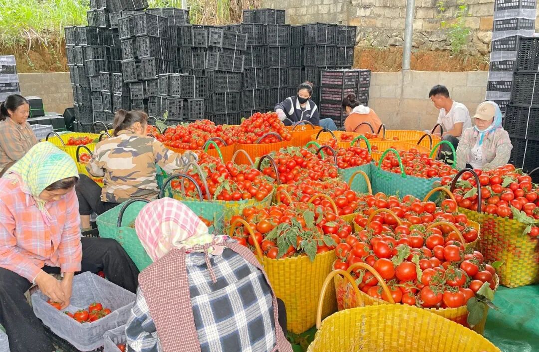 在和强村华强坡西红柿种植基地,村民苏大姐正将刚采摘的两大筐西红柿挑出地里,脸上满是笑意。“我们这的西红柿亩产能达到8000到12000斤,我家今年种了2亩,今天先摘两筐,往后天天都有得卖。”她一边麻利地分拣果实一边笑着说。小小西红柿能有如此“底气”,背后离不开科技的“硬核”支撑。据村干罗志山介绍,华强坡近年来积极采用嫁接育苗技术,通过嫁接,西红柿植株的环境适应力显著增强,不仅有效抵抗病虫害,还实现了产量与品质的双提升。好品质带来了好销路。在村头一处收购点,工人们正忙着将西红柿分级、装箱,一派热火朝天的景象。一位来自新疆的收购商正忙着协调装车事宜,“这次订购的西红柿有一万多斤,先运回新疆,再经口岸发往俄罗斯。”