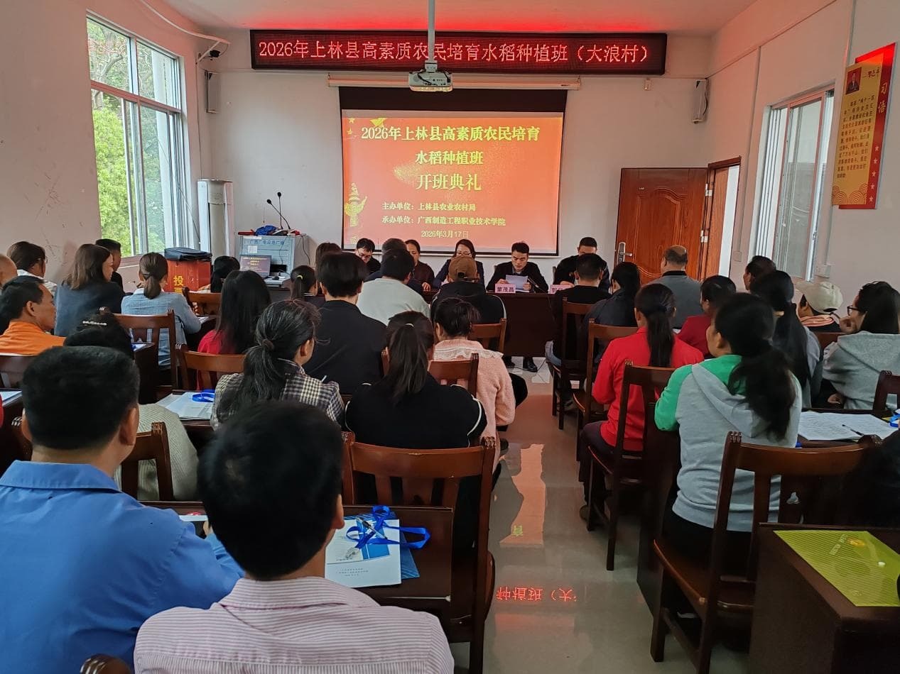 3月17日,2026年上林县高素质农民培育水稻种植班开班典礼在上林县白圩镇大浪村举行。上林县农业农村局、广西制造工程职业技术学院相关领导出席了开班典礼,标志着新一轮高素质农民专业化培训正式拉开帷幕。