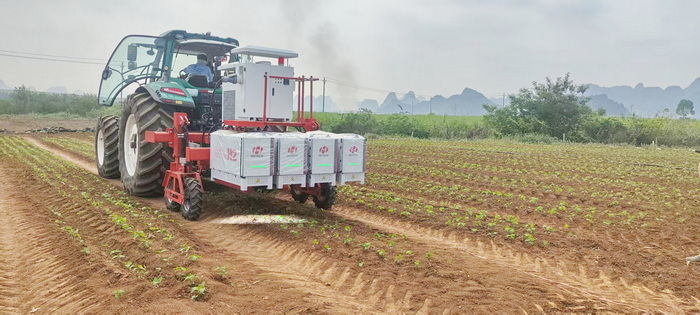 南宁市农业技术推广站联合市旱作场等相关单位,在市农业试验示范推广基地开展激光除草试验,积极探索绿色除草新措施。3月16日,在基地现场,一台拖拉机搭载着专用激光除草设备正在进行田间作业。伴随着激光闪烁和轻微的机械声,玉米地中的杂草在激光照射后逐渐脱水萎蔫。该设备利用激光精准照射杂草分生组织,使细胞液瞬间气化、细胞破裂,从而实现除草效果。该技术无需使用化学农药,无土壤残留,对环境友好,展现出良好的推广应用前景。