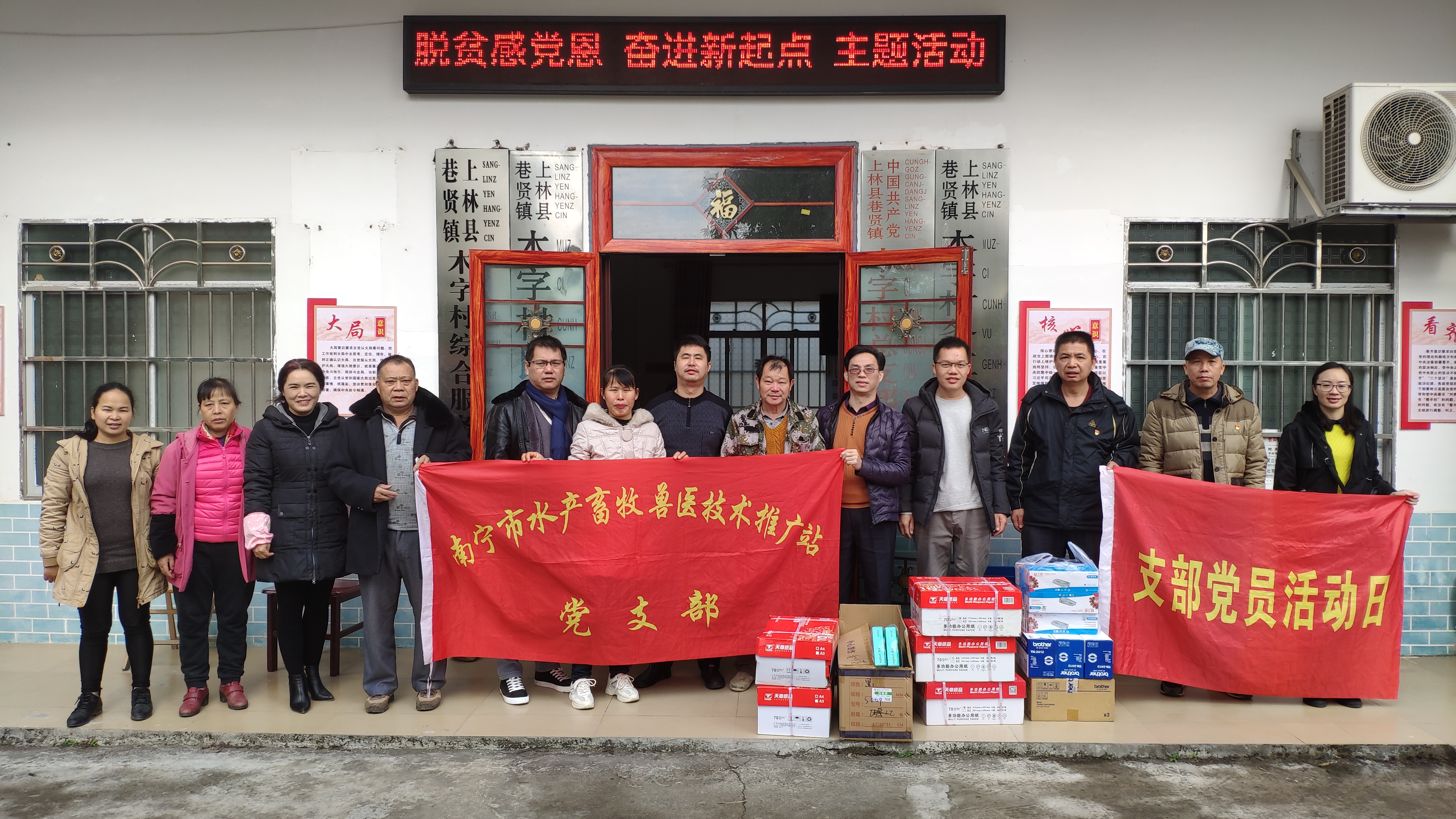 上林县巷贤镇木字村是南宁市水产畜牧兽医技术推广站第一书记派驻后盾单位,该村已于2018年脱贫摘帽。为进一步巩固脱贫攻坚成果,该村依托资源优势,大力发展食用菌、沃柑、水产和畜禽养殖产业,扩大村集体经济和农民收入。南宁市水产畜牧兽医技术推广站派驻第一书记黄立春详细汇报了近期工作开展情况,南宁市水产畜牧兽医技术推广站党支部甘文林书记、李凌波站长分别做了指导,其他党员也积极建言献策,共商发展大计,并现场指导了水产养殖冬季冻害预防,捐赠了办公用品一批。