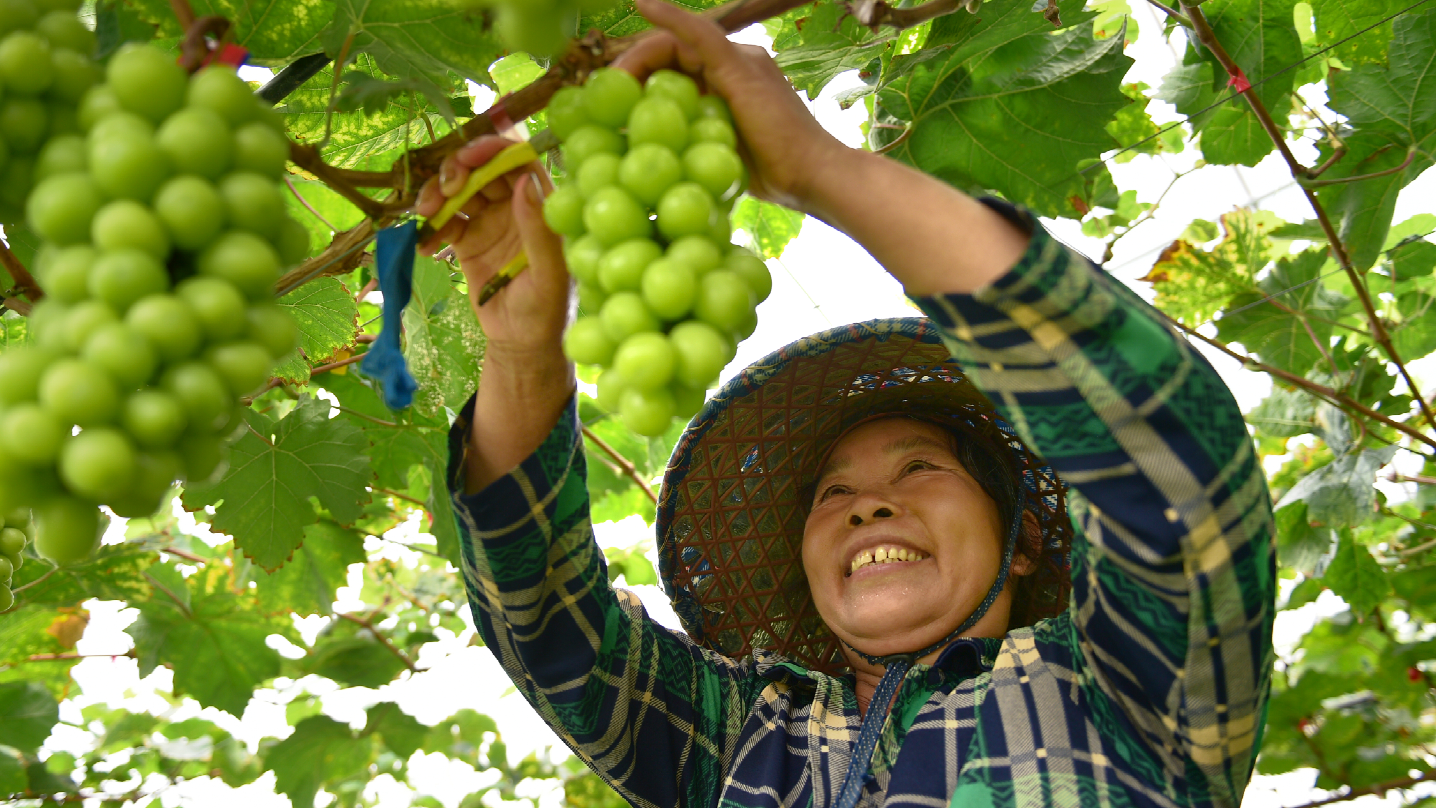 贫困户在白山镇立星村葡萄产业扶贫示范园采收葡萄