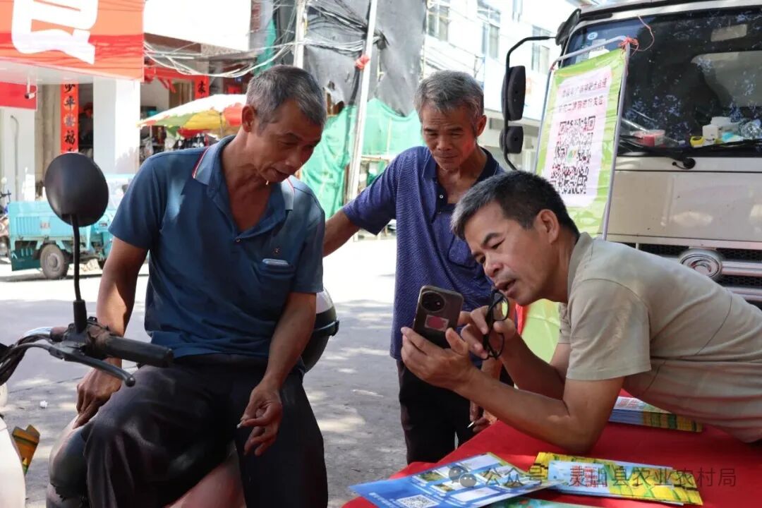在新圩镇集市活动现场,大篷车循环播放的测土配方施肥宣传视频吸引了众多农户驻足;工作人员通过摆放宣传展板、发放技术资料、现场答疑等形式,手把手指导农户使用“广西施肥点点通”手机工具,让科学施肥步骤一目了然。活动累计发放农作物测土配方施肥技术建议卡、科学施肥增效手册、肥料登记管理手册等资料2000份,同时赠送草帽、围裙、袖套、布袋等实用物资,贴心服务赢得农户一致好评。自治区土壤肥料工作站领导为农民群众详细讲解广西施肥点点通小程序的具体操作知识