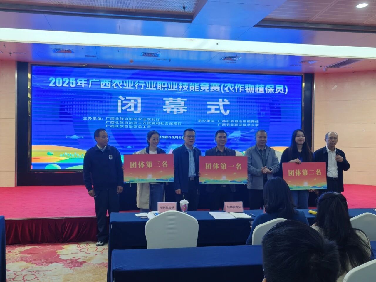 金秋十月,硕果丰收。2025年广西农业行业职业技能竞赛(农作物植保员)于10月29日至31日在南宁市隆重举行,钦州市精心选派的代表队在赛场上团结拼搏,一举夺得团体一等奖,另有来自钦州市植物保护站的黄元腾吉与来自灵山县植物保护站的莫晟琼分别斩获个人第一名与第三名的优异成绩,充分展现了我市植保队伍的过硬实力。