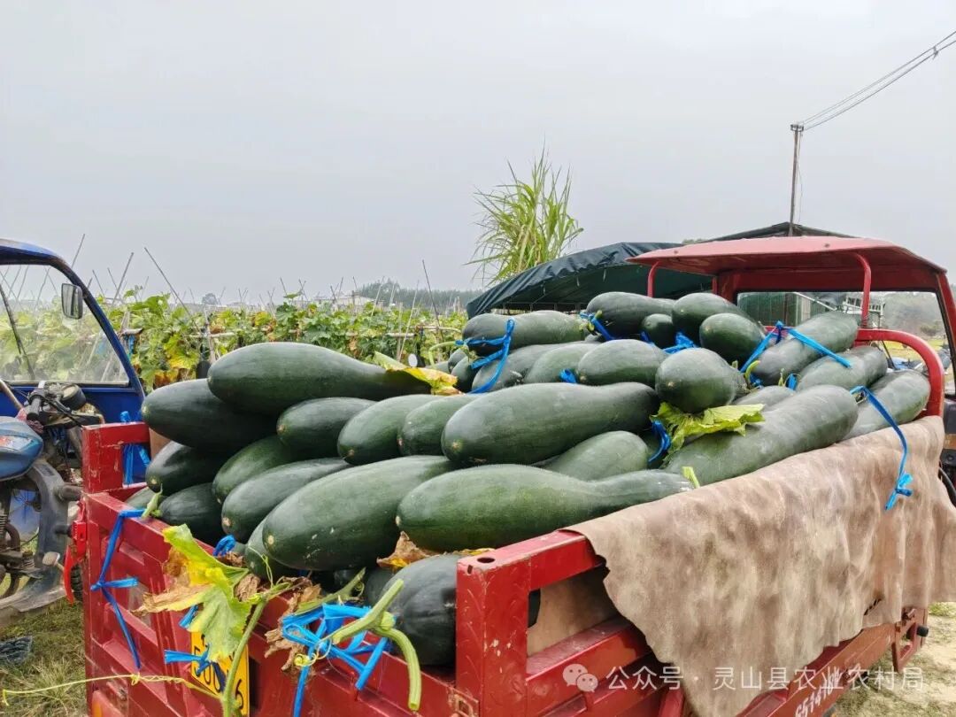 秋日的灵山县田间地头,处处是丰收的喜悦。在檀圩镇种植大户梁海的冬瓜地里,一排排黑皮冬瓜整齐码放,表皮油亮、果形饱满,农户们正忙着采摘、搬运、装车,新鲜采收的冬瓜被麻利地装上三轮车,即将运往各地市场。“以前冬瓜扎堆上市,几毛钱一斤都难卖,今年我错开高峰,1.1元一斤的批发价,16亩地能卖26万多!”梁海看着满车的冬瓜,难掩笑意。