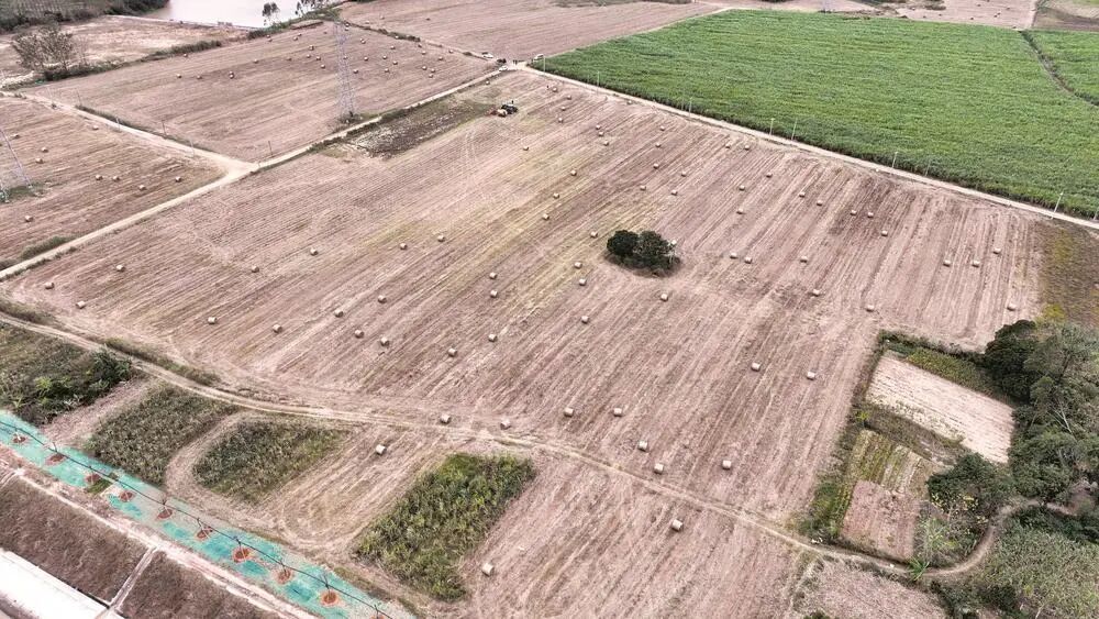 运河对岸的沙田村,收割后的蔗地里,一捆捆近千斤重的秸秆整齐码放。这是秸秆综合利用项目的成果。现场,搂草机将碎秸秆搂集成堆,打包机随后将秸秆吸入、压实、捆扎,吐出一个个体积硕大、扎实紧致的圆形草捆。原本杂乱的地块,顿时干净整洁。