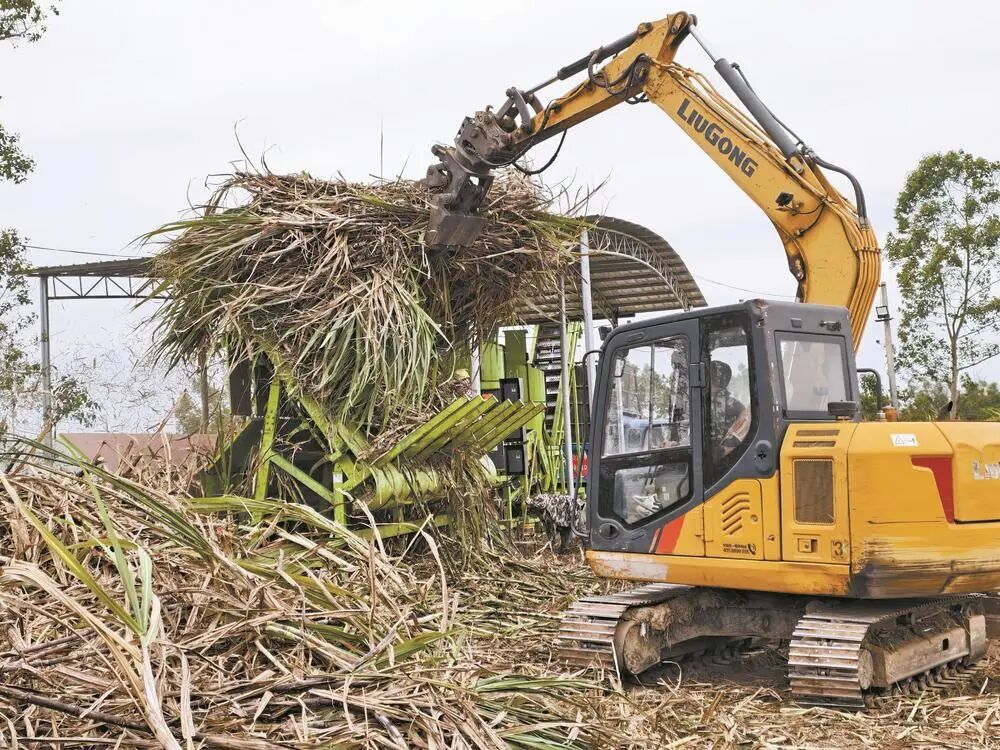 在久隆镇高效机收糖料蔗生产全程机械化示范基地,分步式机收除杂项目现场同样忙碌。一台糖料蔗除杂设备正高速运转,操作员熟练地驾驶着机器,将一根根甘蔗抓取并放入传送带。随后,这些甘蔗带着蔗叶和蔗梢被送入除杂设备。在出料口前端,一辆货车静静地等待着。当甘蔗经过剥叶除杂后,除杂设备会直接将切好的甘蔗段送入车厢中。整个除杂过程既省时又高效,让人赞叹不已。该设备日处理量可达100吨,高峰时能处理200吨以上。