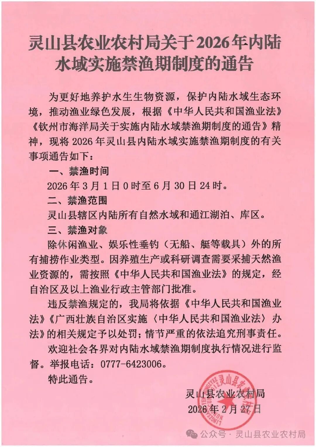 灵山县农业农村局关于2026年内陆水域实施禁渔期制度的通告