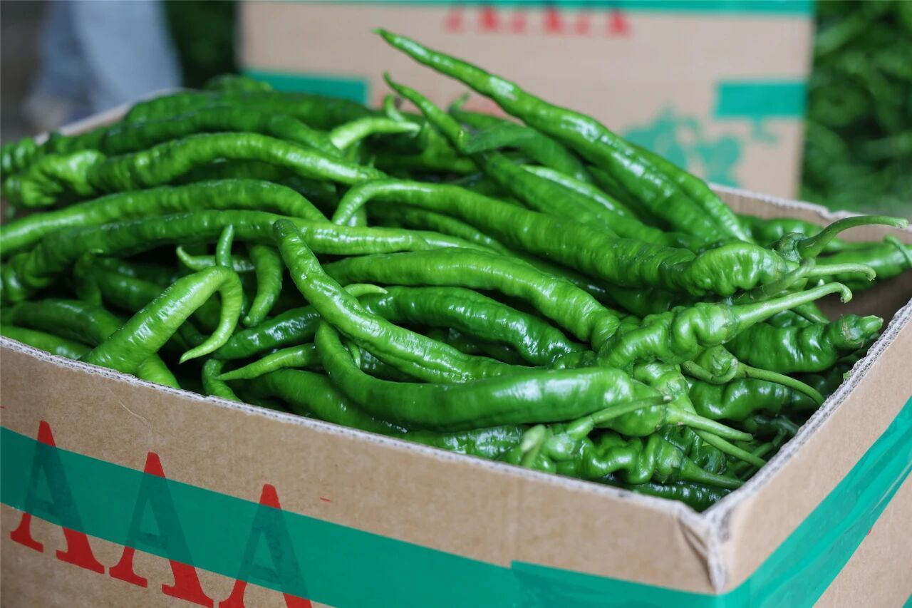 那丽镇种植辣椒历史悠久,是当地群众增收的重要支柱产业。去年全镇辣椒种植面积约2.8万亩,产量达5.7万吨,产值约2.8亿元。在收购商陈在荣辣椒收购点,前来售卖的椒农络绎不绝,摊位上整齐摆放着青皮尖椒、螺丝椒、大皱皮、鸡肠椒等26个品种,格外鲜亮。傍晚过后,收购商将这些整理打包好的辣椒统一运至镇里的冷冻库进行降温处理,再通过冷链物流发往全国各地。