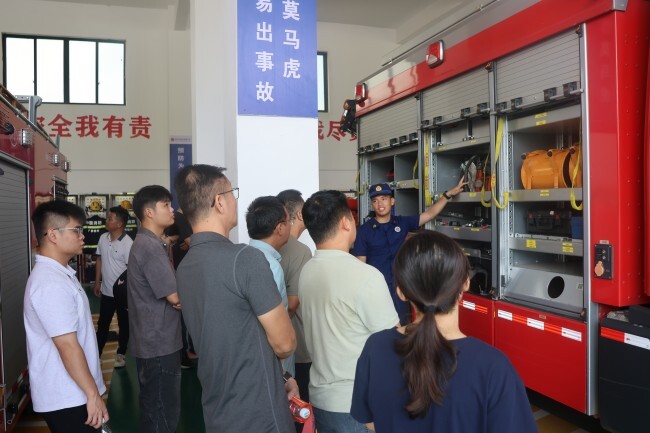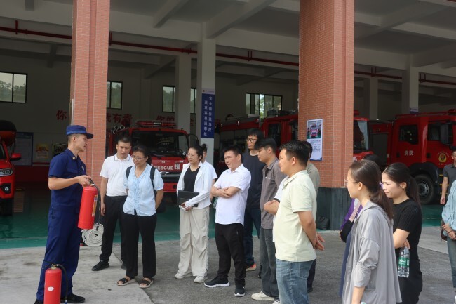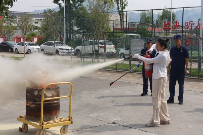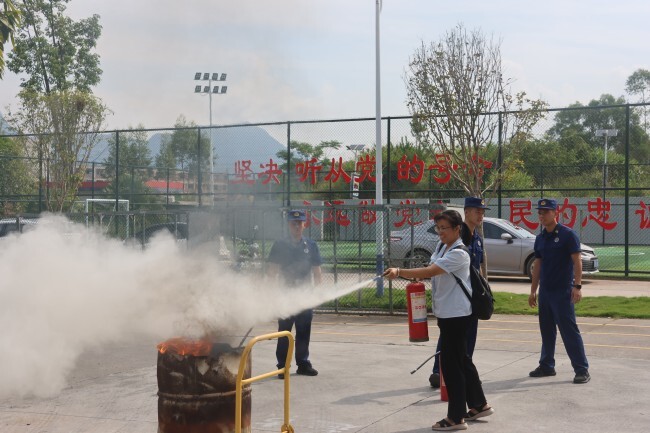 理论学习结束后,消防队员现场展示消防车辆功能与各类消防器材,引导参训人员近距离观察了解器材用途。在专业指导下,部分参训人员亲身参与灭火器、消防水带等器材的实操演练,严格按照“提拔握压”操作步骤,成功完成模拟着火区域干粉喷射灭火作业,有效控制并扑灭“火势”。这种“知识培训+现场操作”的模式,让参训人员对消防安全知识有了更深入的理解,同时熟练掌握了实用消防技能。