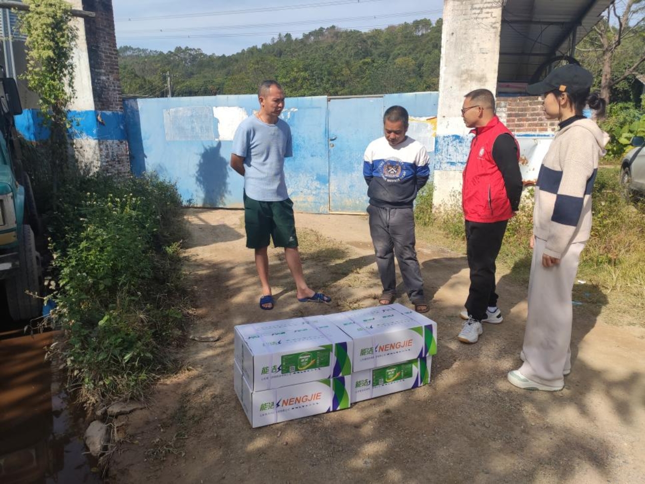 针对部分农户消毒药、饲料储备不足、营养配比不合理的问题,联合服务队精准对接需求,现场发放消毒药120公斤,定制化秋冬鸡场专用饲料 1200 公斤。这款饲料由特派员们联合广西冠昌农牧有限公司结合本地气候创新配比,添加了增强免疫力的中草药、益生菌和维生素,能帮鸡群抵御低温应激,西岸村鸡场老板欢哥点赞称:“特派员不光送料,还教咋喂更科学,太实用了!”