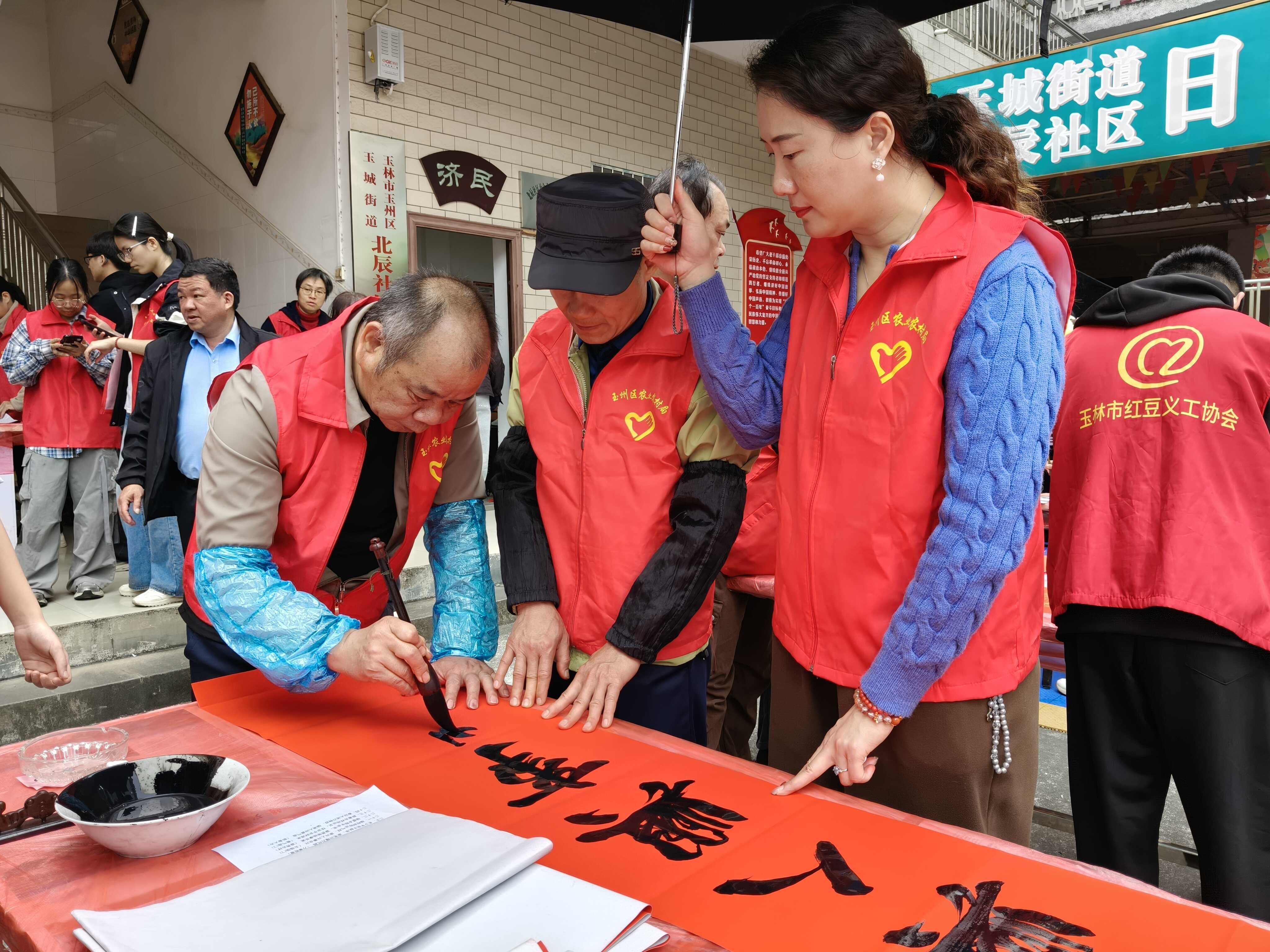 墨香氤氲冬日暖,党徽熠熠映春红。为弘扬中华优秀传统文化,营造欢乐祥和的节日氛围,丰富社区居民精神文化生活,增进邻里感情,2026年2月5-6日,玉州区农业农村局机关党委组织在职党员志愿者,携手玉州区图书馆等14家单位,走进玉城街道北辰社区、城西街道新团社区,共同开展“翰墨飘香迎新春,巧手剪纸纳百福”主题志愿服务活动,以笔墨丹青、玲珑巧艺,为社区群众送去最真挚的新春祝愿。