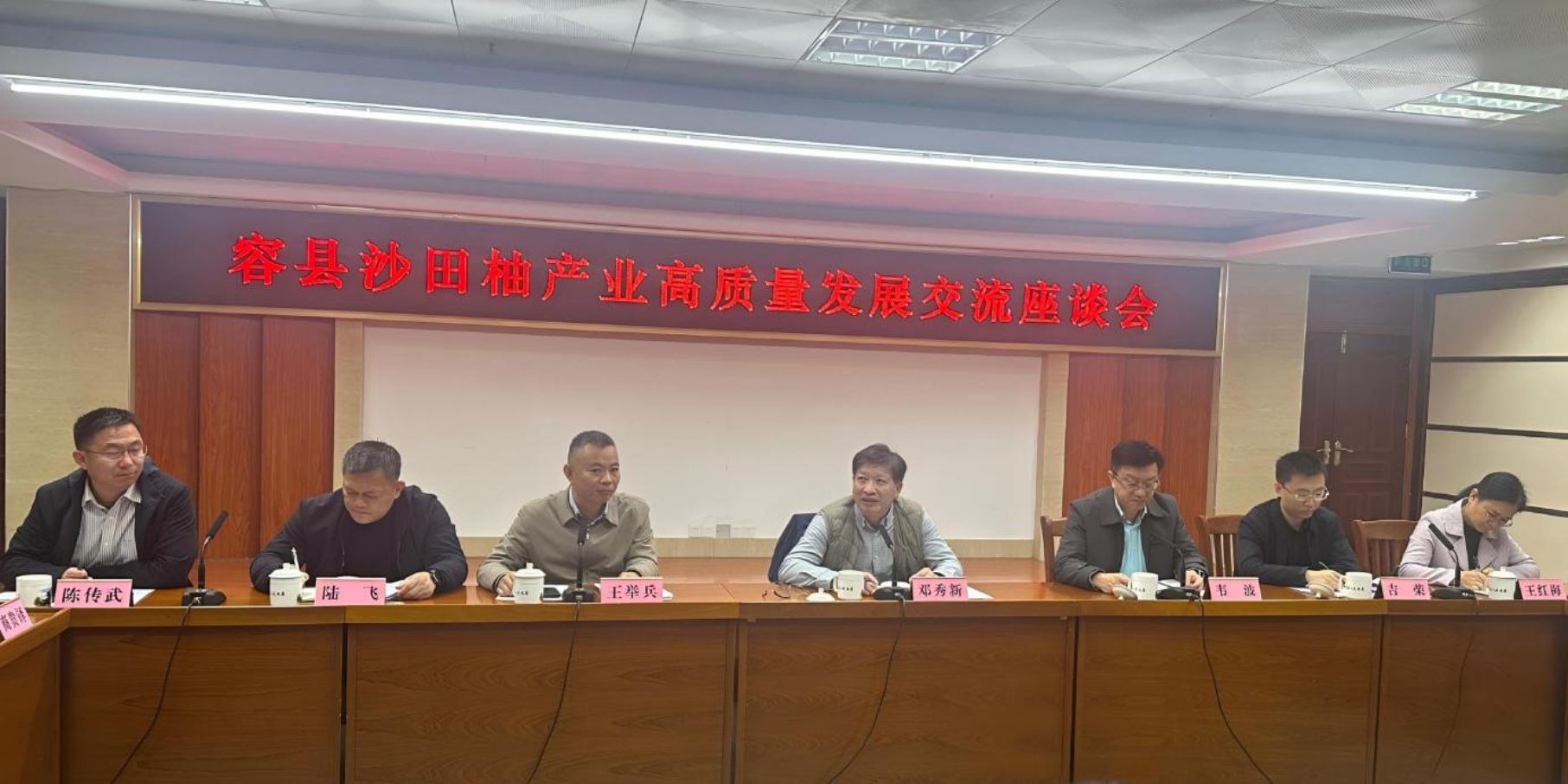 调研期间,邓秀新副院长(中)与自治区农业农村厅、玉林市、容县等各级领导及技术人员在容县人民政府进行座谈交流。