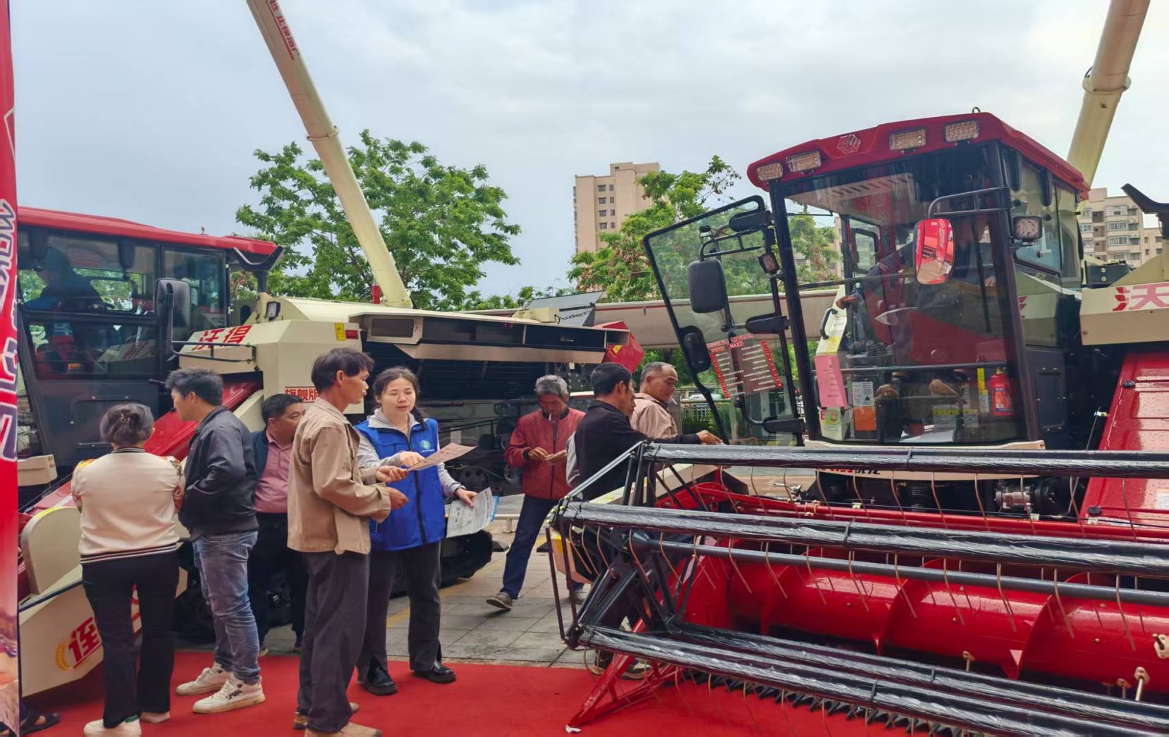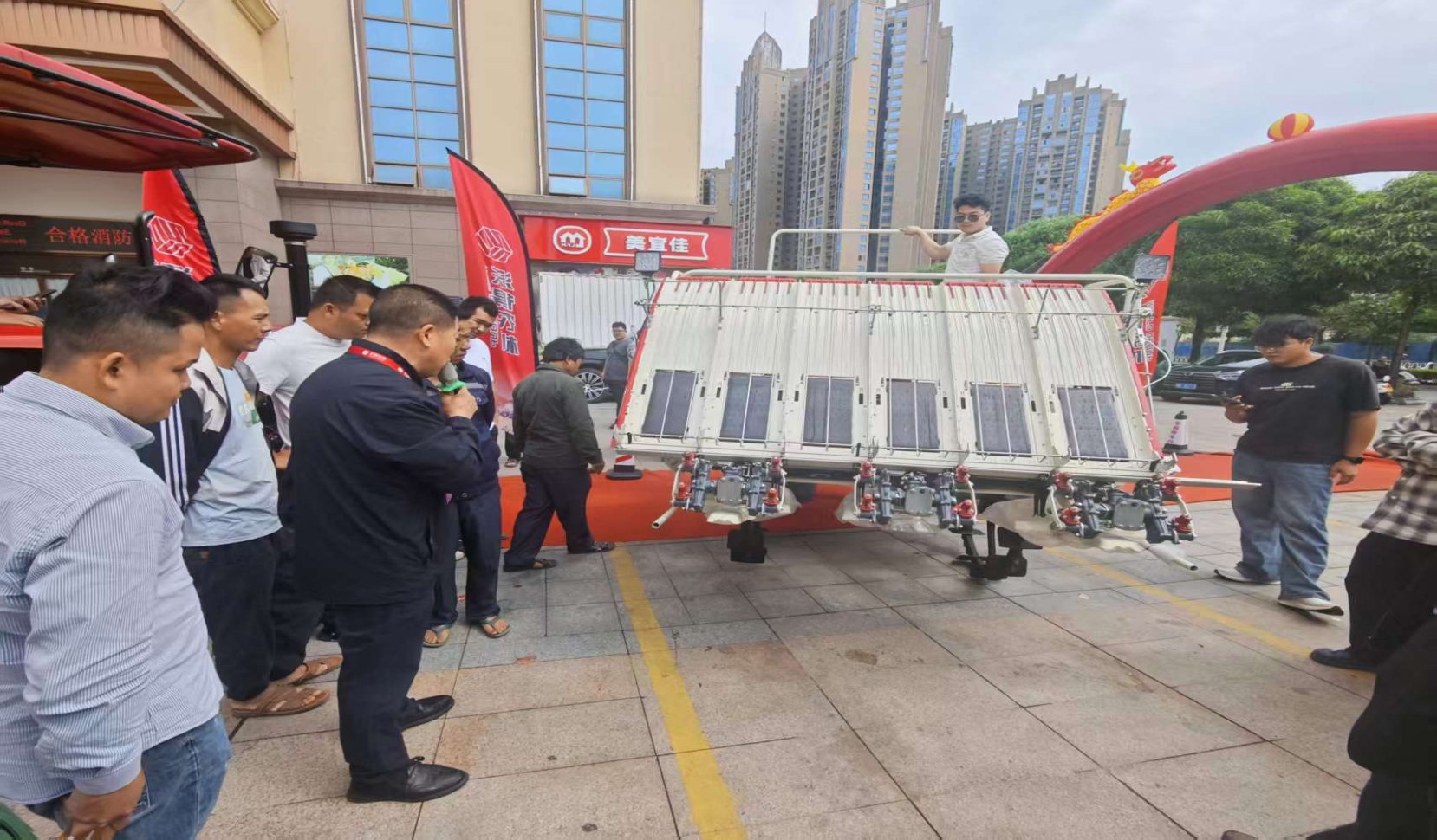 在室外机具展示环节,沃得农机经销商携最新研发的“沃得龙系列”新品惊艳亮相,成为全场瞩目的焦点。技术人员现场启动了新款插秧机和收割机,进行了动态动作展示。其中,插秧机8小时可作业80亩,收割机的割台升降、拨禾轮转动等液压动作连贯流畅,充分展现了国产高端农机在精细化与可靠性上的突破。