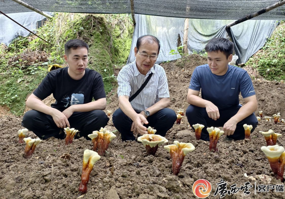 专家团队在灵芝种植基地查看灵芝覆土栽培生长态势。(广西特色作物研究院吴京城供图)
