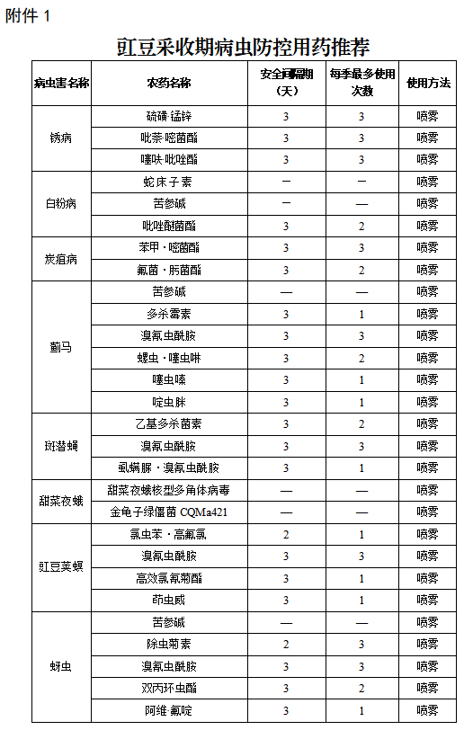采收期的病虫害防治,根据当地抗药性监测结果,科学选择豇豆登记的高效农药,坚持选对药、用好药、少喷药原则,按标签规定剂量用药,推荐选用生物农药和安全间隔期3天以内的化学农药,不得使用禁限用农药。