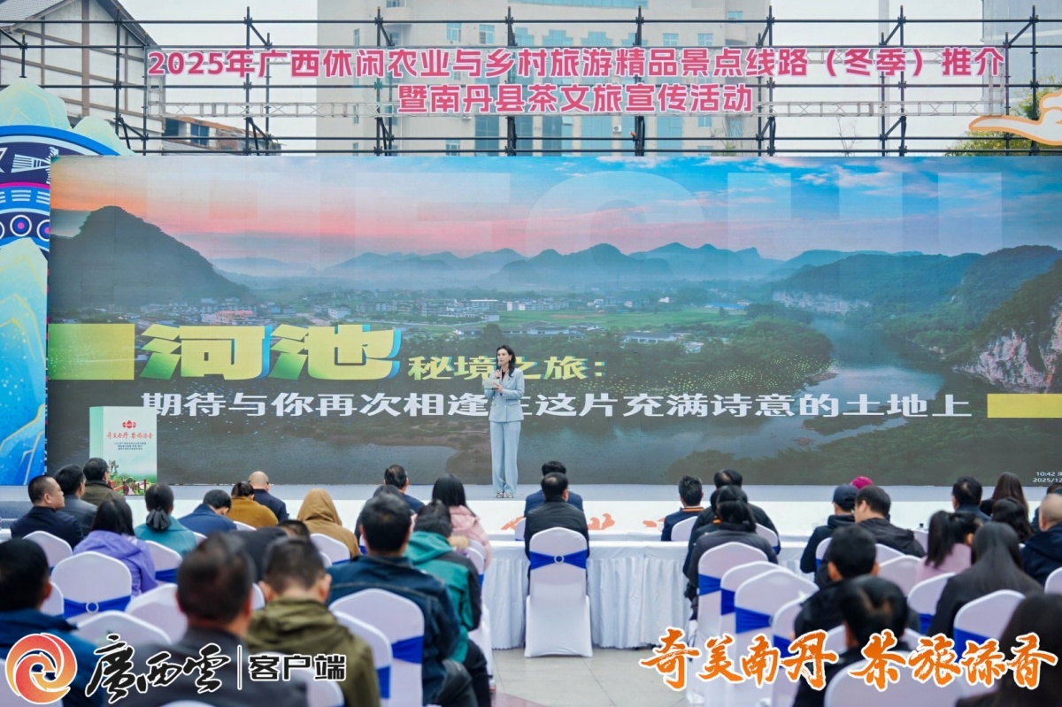 12月10日上午,由自治区农业农村厅、文化和旅游厅、体育局联合主办,中共南丹县委员会、南丹县人民政府承办的“2025年广西休闲农业与乡村旅游精品景点线路(冬季)推介暨南丹县茶文旅宣传活动”在河池市南丹县举行。活动旨在展示广西农文旅独特魅力,推动广西生态优势转化为发展优势,助力乡村全面振兴。