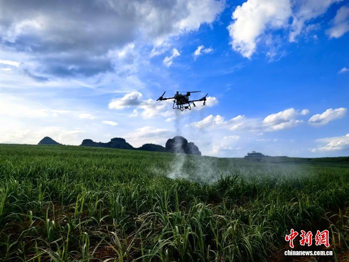 无人植保机在蔗地植保作业。(资料图)赵霓虹 摄