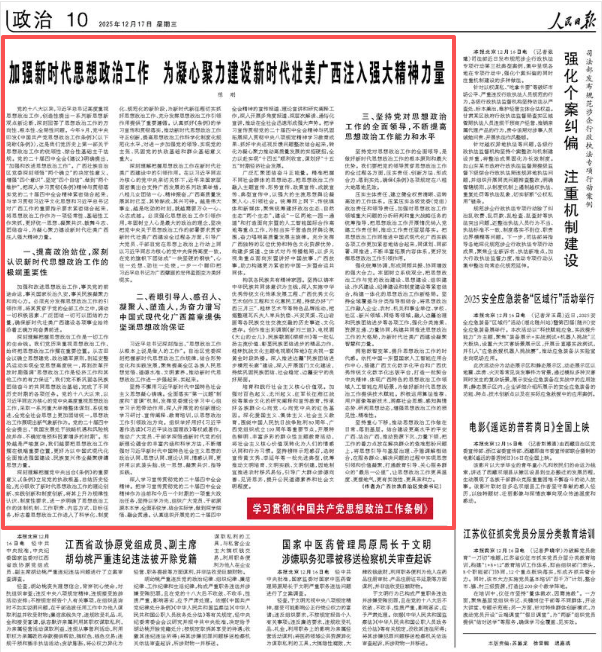 12月17日,《人民日报》刊发广西壮族自治区党委书记陈刚署名文章《加强新时代思想政治工作 为凝心聚力建设新时代壮美广西注入强大精神力量》,全文如下——