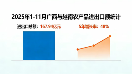 桂越农产品贸易依托完善的跨境通道网络持续扩容,成为双边经贸合作的“压舱石”。2025年1—11月,广西与越南农产品进出口额167.94亿元人民币,5年间增长48%;其中,越南有112亿元人民币农产品进入广西,同比增长10.7%。广西与越南水果进出口占广西与越南农产品进出口的40%以上,占全国与东盟水果进出口的1/3以上。