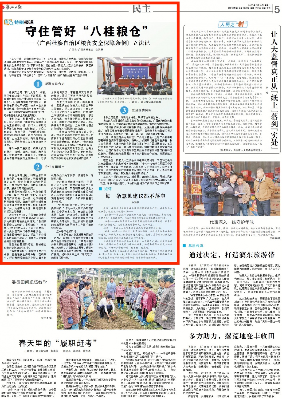 从深入一线的调研走访,到反复打磨的条文修改,再到人民代表大会上的庄严表决,这部条例凝聚了社会各界的智慧与期盼。5月1日起,条例将正式施行,法治的力量将为广西粮食安全保驾护航。