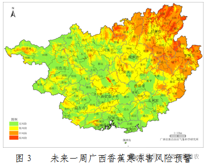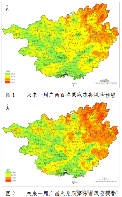 根据百香果、火龙果、香蕉寒冻害风险预警模型,预计未来一周百香果、火龙果和香蕉寒冻害中度以上风险区域占比分别为18.87%、30.93%、31.58%,主要分布在桂东地区;轻度风险区域占比分别为48.29%、36.77%、40.53%,主要分布在桂南、桂西地区(图1-图3);将对当地百香果、火龙果、香蕉等热带亚热带水果生产带来不利影响。