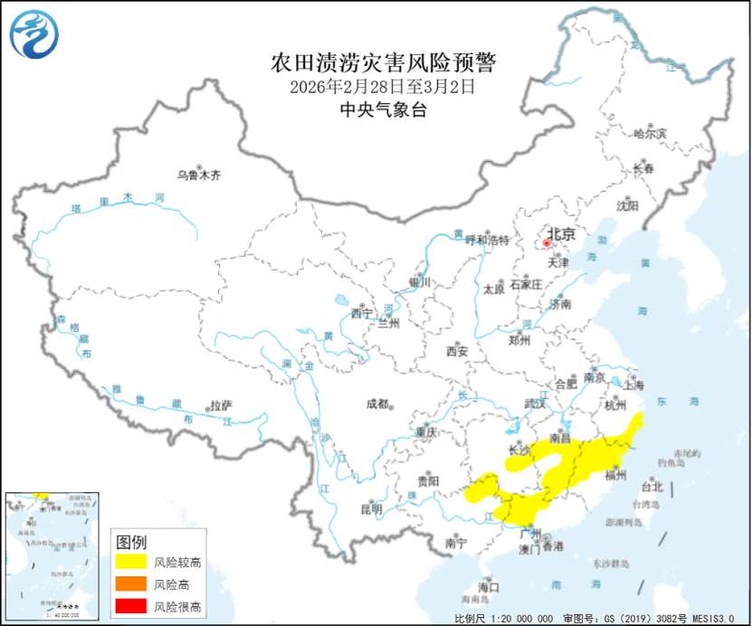 农业农村部和中国气象局2026年2月27日联合发布农田渍涝灾害风险预警:预计2月28日至3月2日,黄淮及其以南地区将出现大范围降水过程,江南、华南等地部分地区有大到暴雨,并伴有分散性雷暴,湖南东部、江西南部、福建北部、广东北部、广西东北部等地低洼农田渍涝灾害风险较高,易造成油菜长势减弱,根系早衰,土壤肥力流失。建议:上述地区及时疏通沟渠,确保排水通畅,防范田间积水和渍涝害;雨后及时补施速效肥,同时加强油菜菌核病等病虫草害监测与防治。