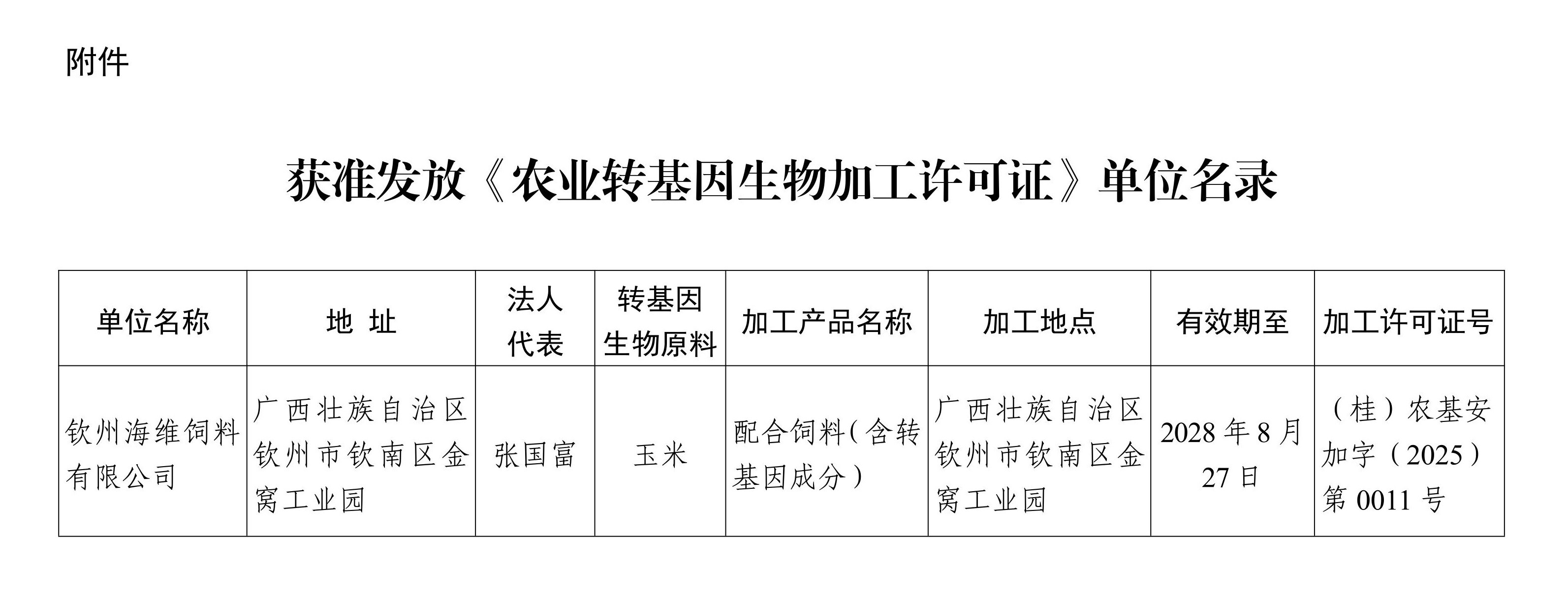 钦州海维饲料有限公司于2025年7月31日向我厅申请办理《农业转基因生物加工许可证》。依据《农业转基因生物安全管理条例》和《农业转基因生物加工审批办法》有关规定,我厅对上述企业申请农业转基因生物加工许可的材料进行了审核,并组织专家小组到现场实地考察。根据审核和考察结果,决定发放钦州海维饲料有限公司《农业转基因生物加工许可证》,现予公告。