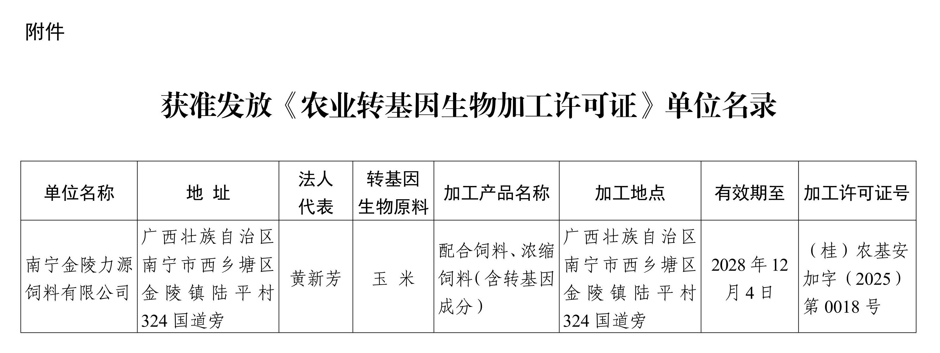 南宁金陵力源饲料有限公司于2025年11月14日向我厅申请办理《农业转基因生物加工许可证》。依据《农业转基因生物安全管理条例》和《农业转基因生物加工审批办法》有关规定,我厅对上述企业申请农业转基因生物加工许可的材料进行了审核,并组织专家小组到现场实地考察。根据审核和考察结果,决定发放南宁金陵力源饲料有限公司《农业转基因生物加工许可证》,现予公告。