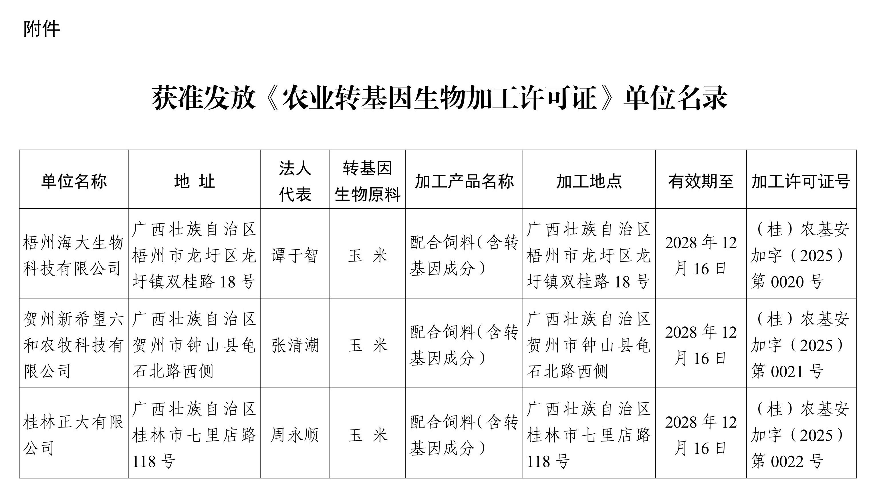 梧州海大生物科技有限公司、贺州新希望六和农牧科技有限公司、桂林正大有限公司分别于2025年11月19日、11月26日、11月28日向我厅申请办理《农业转基因生物加工许可证》。依据《农业转基因生物安全管理条例》和《农业转基因生物加工审批办法》有关规定,我厅对上述企业申请农业转基因生物加工许可的材料进行了审核,并组织专家小组到现场实地考察。根据审核和考察结果,决定发放上述公司《农业转基因生物加工许可证》,现予公告。