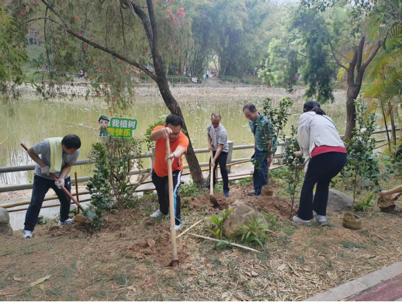 活动现场,干部职工热情高涨,大家分组协作、分工明确,挥锹铲土、扶苗定植、培土压实、提水浇灌,每一道工序都细致规范、有条不紊。经过一番辛勤劳作,一株株四季红山茶花树苗在园区内迎风挺立,错落有致的新苗点缀春日景致,尽显生机盎然。