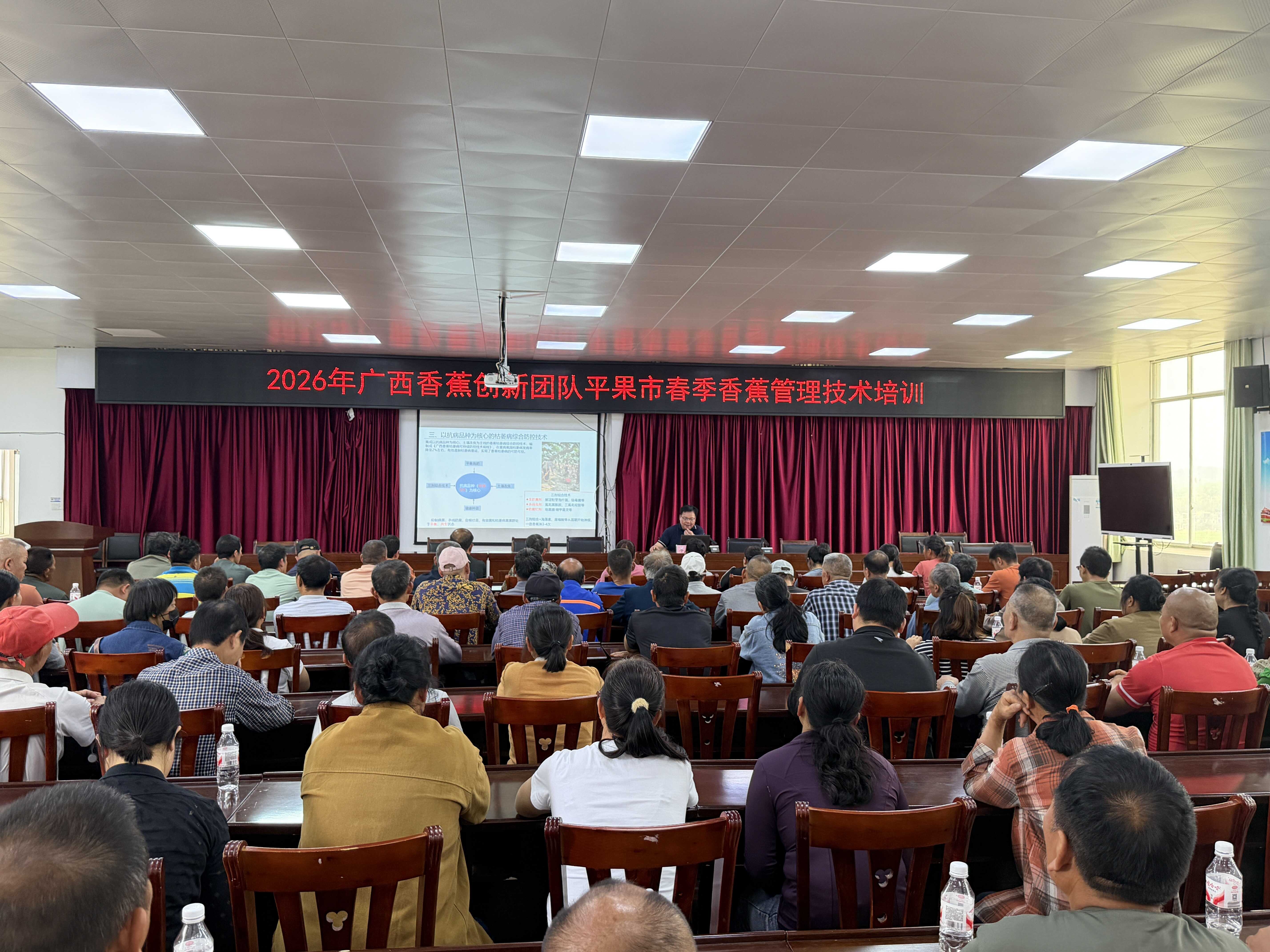 近日,广西香蕉创新团队联合平果市农业农村局和平果市太平镇人民政府举办2026年香蕉春季管理技术培训。此次培训采用“室内授课+实地指导”相结合的模式,平果市当地技术骨干及种植户共计110余人参与了培训。