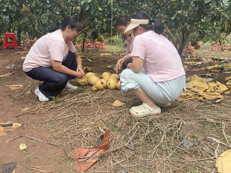 此时正值容县蜜柚成熟关键期,金黄饱满的果实挂满枝头,蜜柚不仅是当地农民增收的“黄金果”,更是当地农业产业的重要组成部分。为最大限度降低台风和暴雨对蜜柚果园造成的经济损失,广西柑橘创新团队桂东综合试验站技术团队于近日紧急赶赴容县自良镇大里村,开展蜜柚防汛防台风指导工作。针对蜜柚成熟期果实吸水过多易引发裂果的特性,技术团队现场指导柚农对果园实施树盘覆膜管护措施,通过物理阻隔雨水直接渗透土壤,降低蜜柚果实因吸水膨胀导致的裂果风险,同时避免积水造成根系缺氧腐烂,全力保护蜜柚产能,保障果农经济收益。