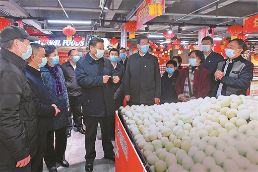 前来置办年货的群众热情向总书记问好。习近平亲切询问大家年货备齐没有。习近平强调,各级党委、政府和领导干部要把事关百姓切身利益的事情抓实抓好,尤其要落实防疫措施,加强食品安全监管,确保百姓过年安心、放心、舒心。