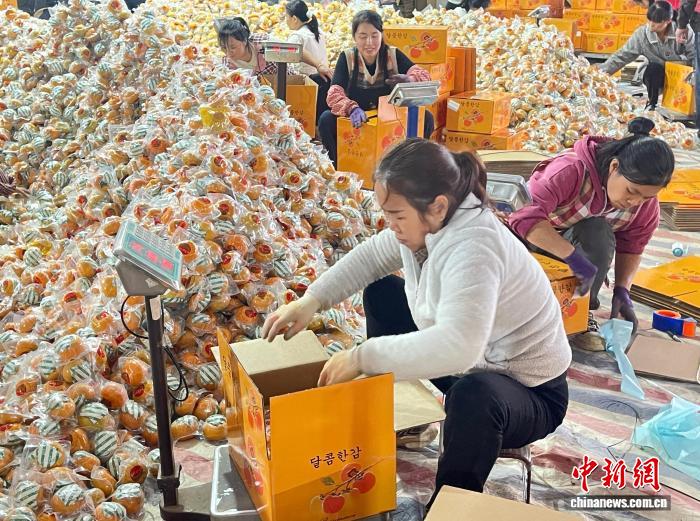 图为广西桂林市恭城瑶族自治县黄竹岗村的村民正在打包柿子发往全国各地。何茜 摄
