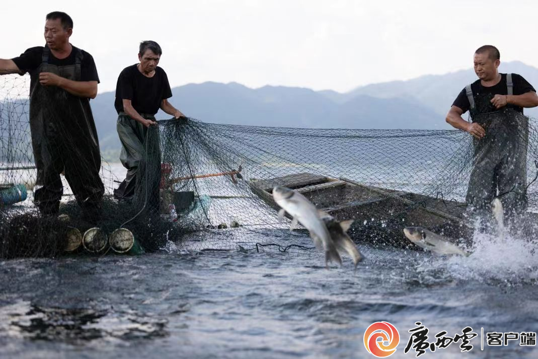村民在青狮潭水库收网捕捞生态鱼。灵川县生态移民发展中心供图