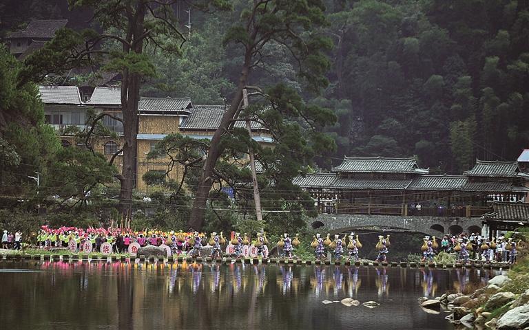 10月18日,在柳州市融水苗族自治县安太乡培秀村,村民们展示稻渔文化。