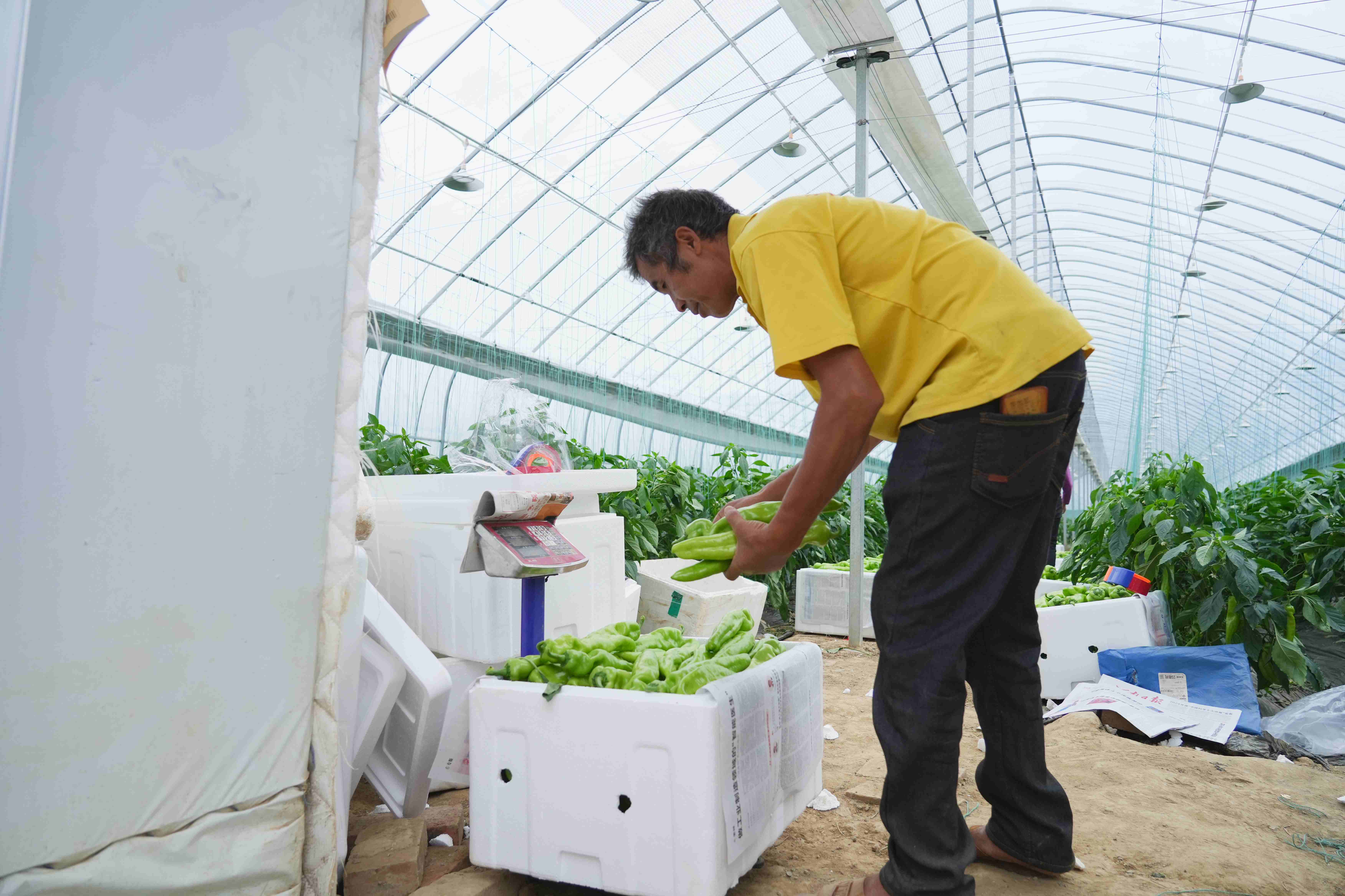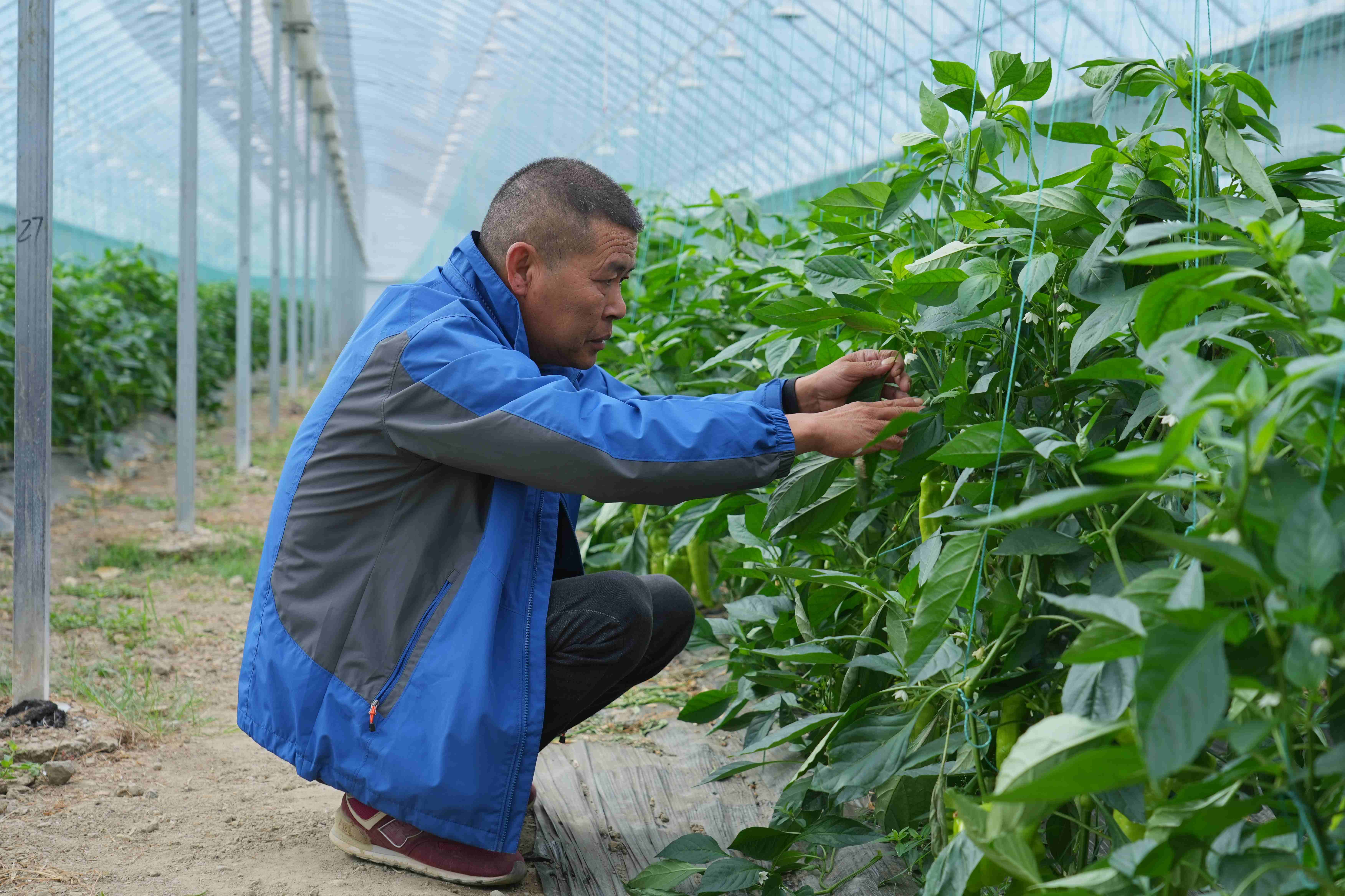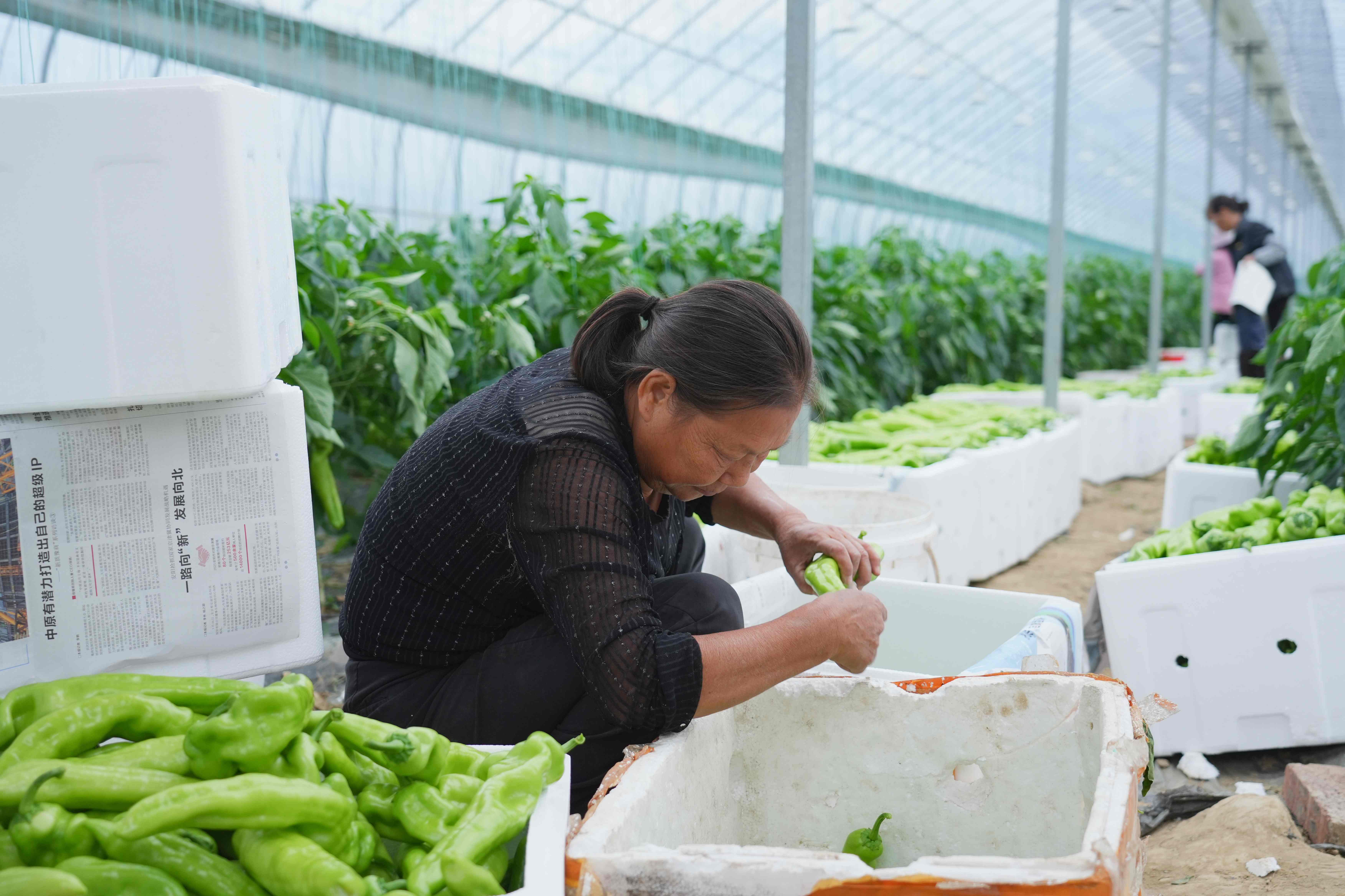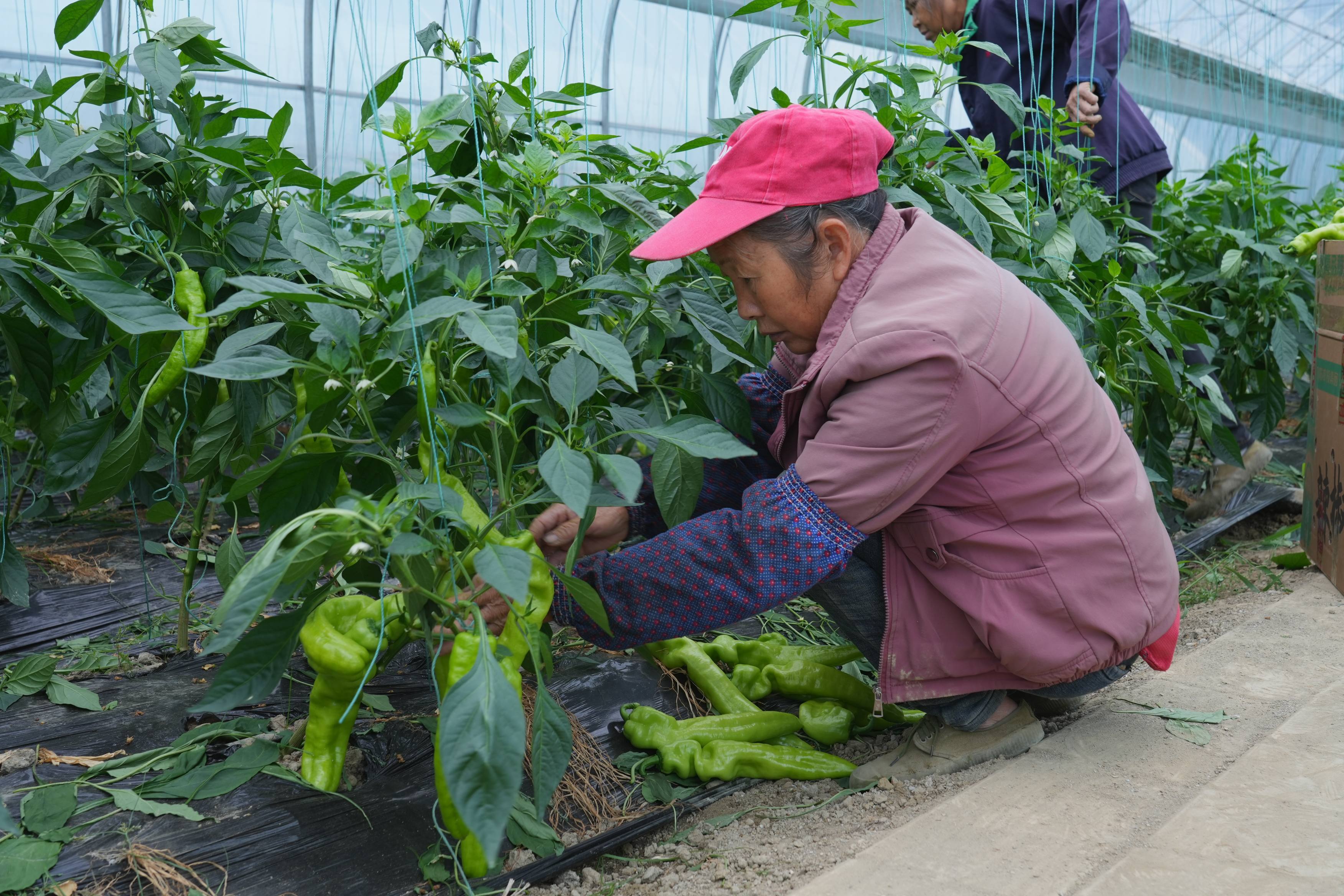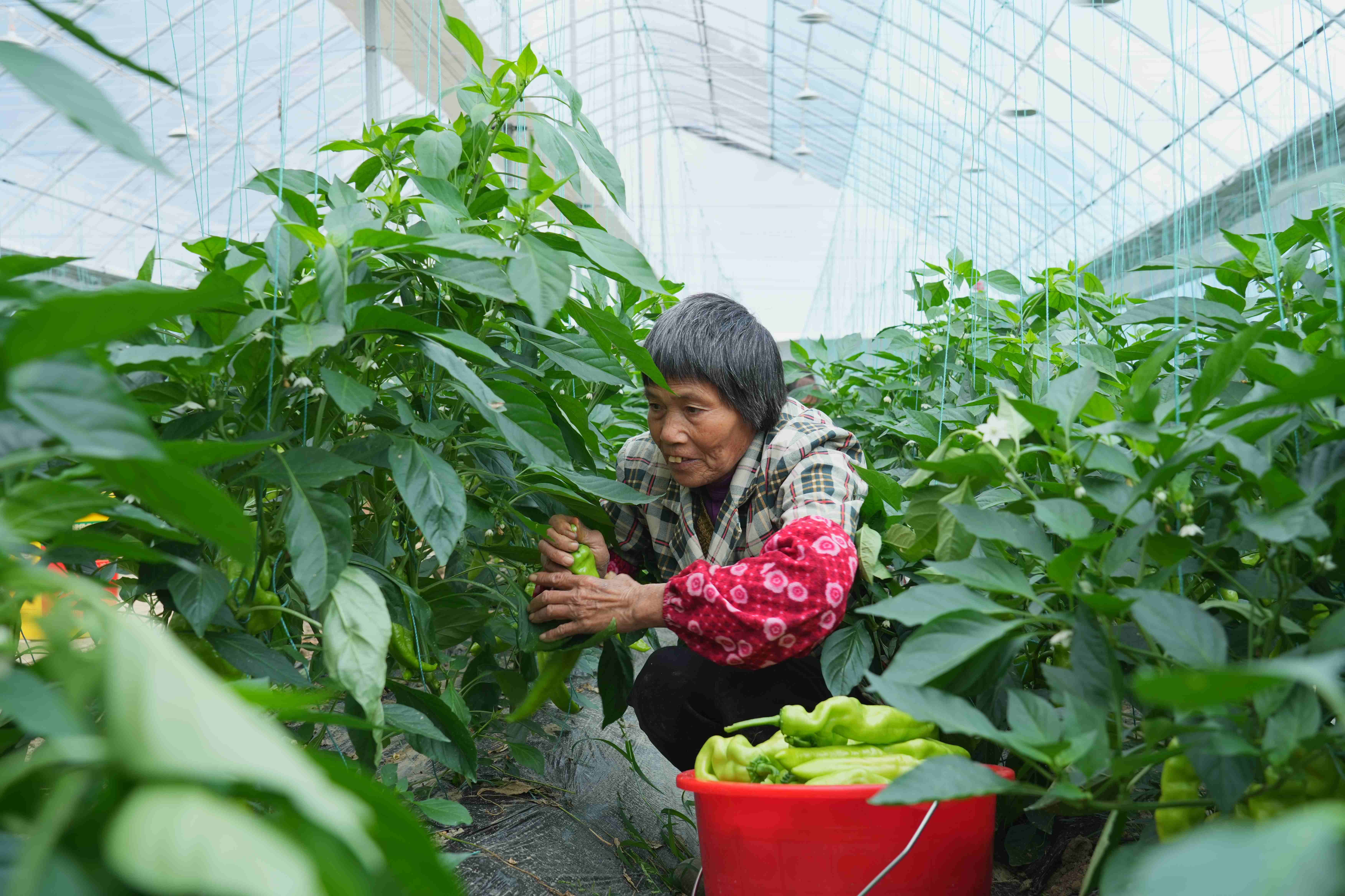 村民在蔬菜种植基地里采摘黄皮尖椒