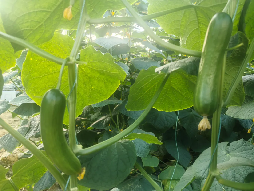 在黄瓜种植区,藤蔓上挂满了翠绿欲滴的水果黄瓜。这些优质品种以其皮薄肉脆、清香甘甜的特点备受期待。种植过程中,基地严格遵循绿色种植标准,采用物理防虫等生态措施,确保产品安全优质。工人们穿梭其间,通过科学照料为作物生长提供最优条件。