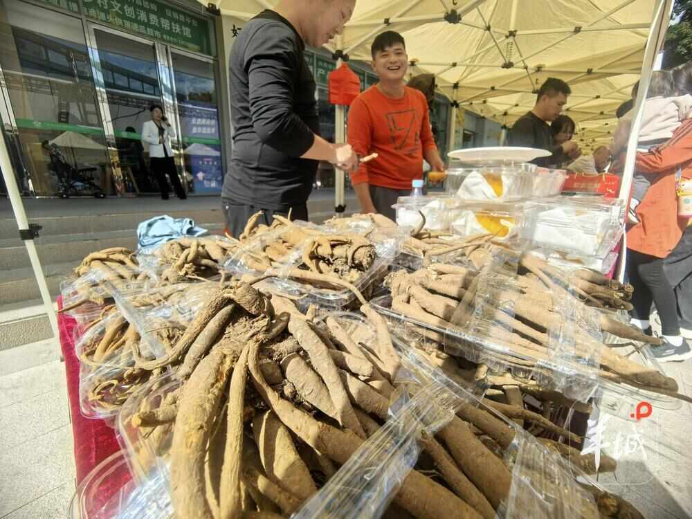 线下互动同样精彩纷呈,各展位内洞酵指天椒、甜当归、坚果、星油藤茶、龙须菜、指天椒、水牛奶等百余种农特产品整齐陈列,并设置了品鉴区免费供市民品尝。壮锦、非遗文创等文旅手工艺产品也吸引了不少采购商当场表达合作意向。