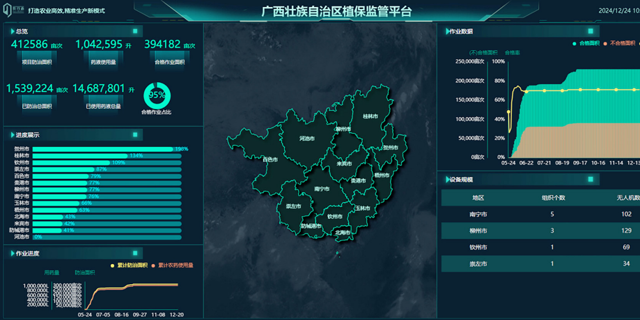 平台基于植保无人机、GIS等技术,构建集实时监控、数据收集与分析、作业指导与评估于一体的全流程监管系统。通过数据推送模式接入全国主流无人机厂商的飞控数据平台,实时采集作业时间、位置、轨迹、飞行参数(飞行高度、速度、喷洒量等)及用药信息,将全区植保无人机作业轨迹汇总至地理信息“底图”,形成覆盖广西的统防统治“一张图”,实现作业区域分布、进度及质量的可视化管理。